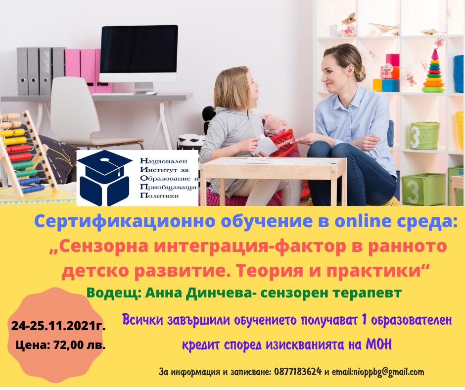 Уебинар на тема „Сензорна интеграция - фактор в ранното детско развитие. Теория и практики“ с водещ Анна Динчева - магистър по специална педагогика с над 10 годишна практика с деца и ученици с аутизъм, ХAДВ, сензорно-интегративна дисфункция и обучителни трудности. Провежда се в две сесии на 24 и 25 . Сензорната интеграция е основен фактор, оказващ силно влияние върху ранното детско развитие. Успешната адаптация, пълноценно общуване и справянето с всички правила/ситуации/изисквания в структурираната учебна среда са основни предизвикателства за всяко дете. За да се справи с тях, детето се нуждае от сензорен опит и познания за собственото тяло и света около себе си. Познаването на процеса на сензорна интеграция в норма и патология, е изключително важен фактор за успешната работа с деца и ученици със СОП и условие за успешното им приобщаване.Работещите с деца със СОП, огромен процент, от които имат нарушена сензорна преработка в различна степен, се нуждаят от теоретична и практическа подготовка, за да познават и отговарят на специфичните им нужди.Участниците ще имат достъп до презентации и други материали чрез специалната онлайн платформата на провежданеноември!Таксата за уебинара е 72 лв.