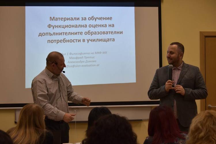 В първия етап от процеса ще бъдат обучени 63 обучители от Регионалните центрове за подкрепа на процеса на приобщаващото образование от цялата страна, които в рамките на две години ще обучат екипите за подкрепа за личностното развитие в детските градини и училища да прилагат класификацията. Обучител и консултант е проф. Манфред Претис от Университета в Хамбург. Голяма част от страните в Европа вече са приели и прилагат тази класификация. Калоян Дамянов, директор на Регионален център за приобщаващо образование-София-град отбеляза по време на първия ден от обучението на обучители, че с тази инициатива се осигурява съществена подкрепа за всички екипи в детските градини и училища, които вече реализират допълнителна подкрепа за личностно развитие. Той наблегна на необходимостта училищните екипи да прецизират достатъчно обхватно оценките на индивидуалните потребности, за да може след това да се изготвят и реализират планове за подкрепа за всяко дете или ученик със специални образователни потребности според индивидуалния му статус.