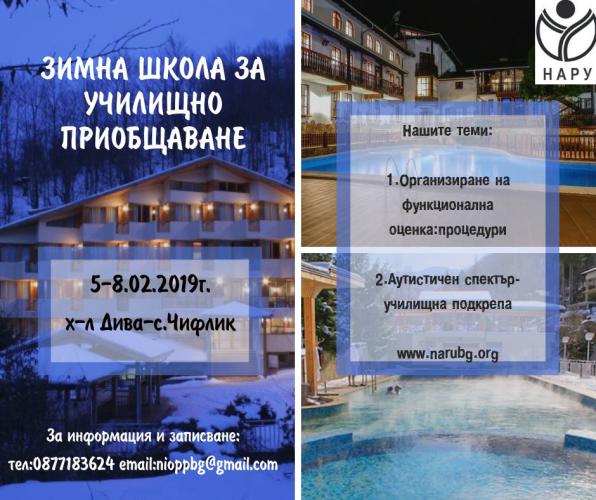 Имаме удоволствието да Ви поканим на поредното издание на нашата Зимна школа за училищно приобщаване. Тази година тя ще се проведе на 05-08.02.2019г. в х-л "Дива" гр.Чифлика, общ.Троян. В страхотната атмосфера на топъл басейн сред снежна декорация ще говорим по две значими теми: 1.Как да изградим процедури за функционална оценка на специалните образователни потребности 2. Какви училищни практики можем да приложим за подкрепа на деца и ученици от аутистичния спектър? Цената е само 368 лв. и включва три нощувки със закуска, обяд, вечеря, учебни материали и удостоверение с 1 образователен кредит според изискванията на МОН. Не напоследно място планираме както всяка година и допълваща социална програма.Станете част от това незабравимо и полезно събитие. Побързайте, местата са ограничени. За повече информация: тел:0877183624 , email:nioppbg@gmail.com